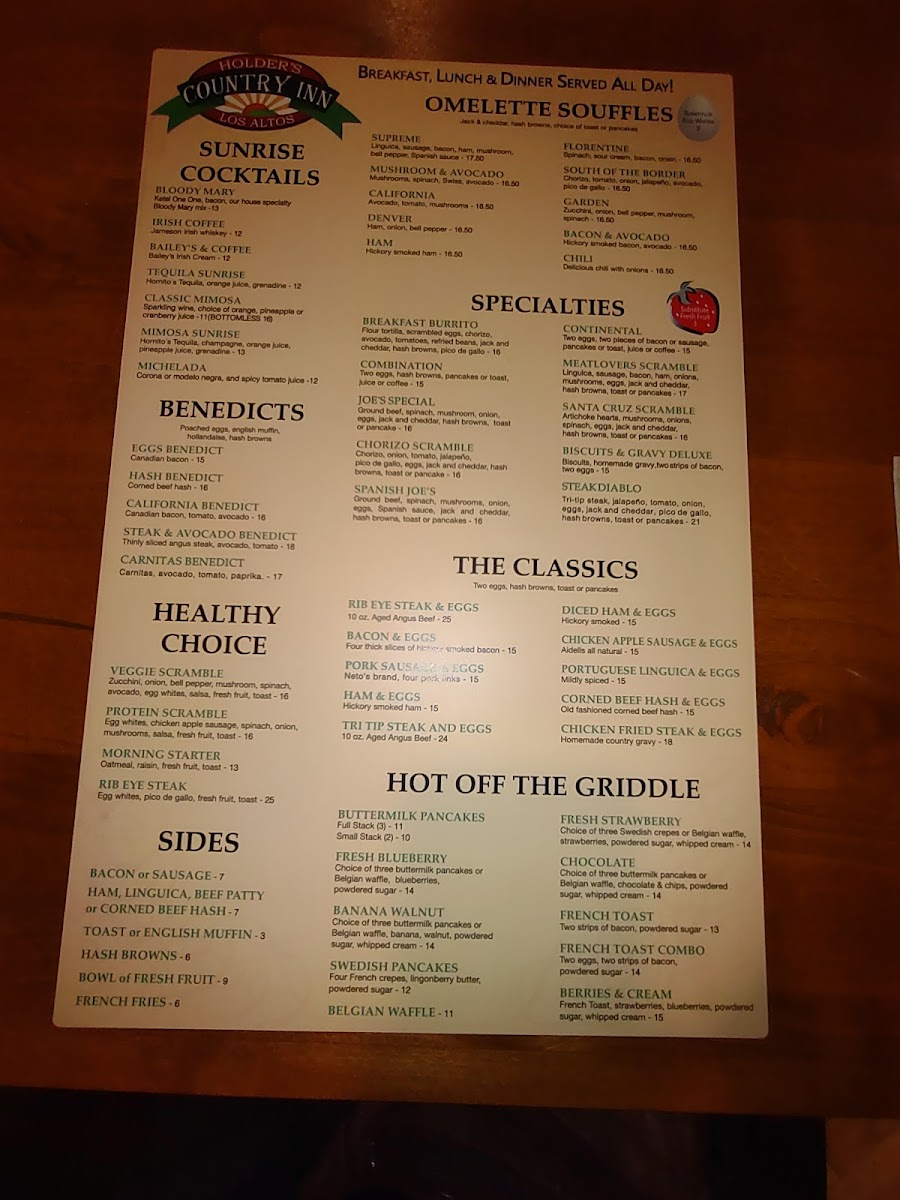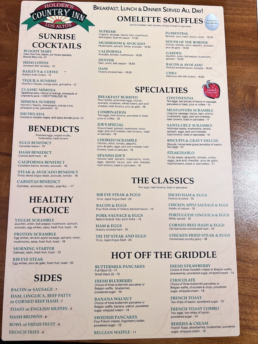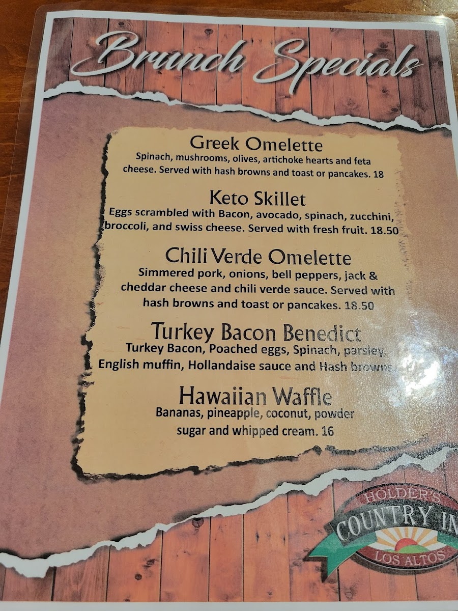 Ground beef, spinach, mushrooms, onion, eggs, Spanish sauce, jack and cheddar, hash browns, toast or pancakes.