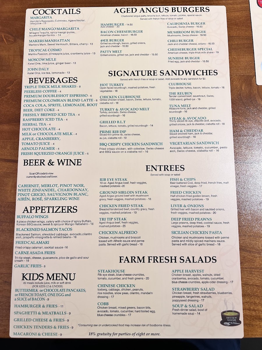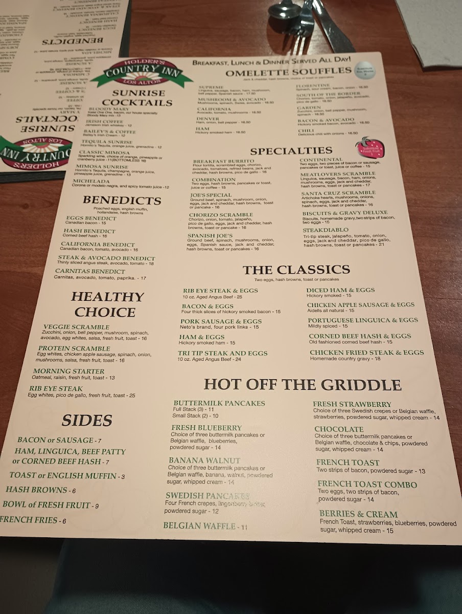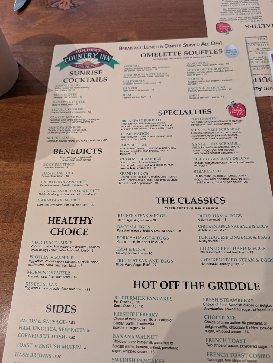 Ground beef, spinach, mushrooms, onion, eggs, Spanish sauce, jack and cheddar, hash browns, toast or pancakes.