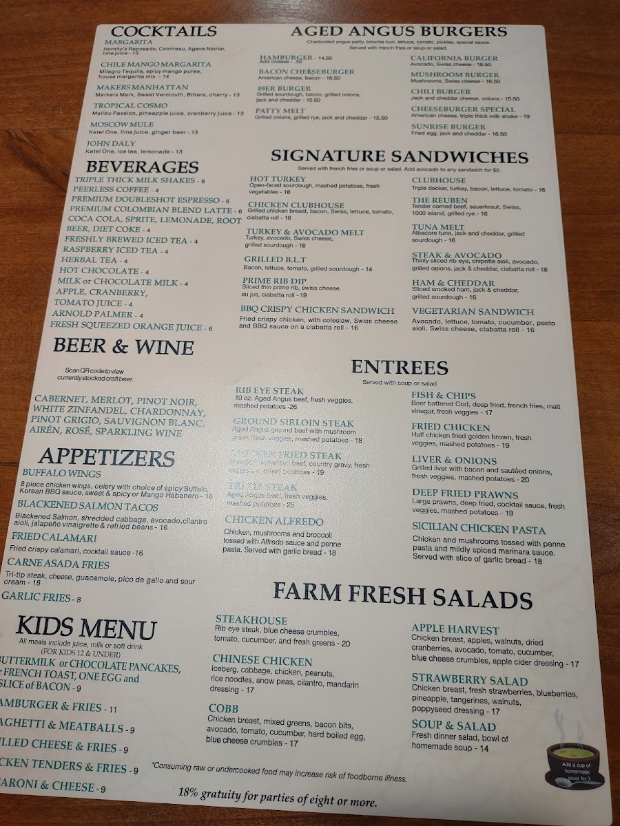 Aged Angus ground beef with mushroom gravy, fresh veggies, mashed potatoes.